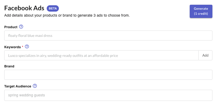Remember, Tako can't "see" your brand or products. In order to get a better idea of what he should be writing and who the ad should be targeted at, he needs more details from you.